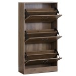 Botník s tromi priehradkami je vyrobený z MDF dosiek s povrchovou úpravou, ktorá napodobňuje prirodzenú štruktúru dreva. Každá priehradka ponúka dostatok priestoru na uskladnenie obuvi a je vybavená čiernymi kovovými úchytkami pre ľahké otváranie. Kompaktné rozmery botníku umožňujú jeho umiestnenie aj do menších priestorov, pričom pevná konštrukcia zaisťuje stabilitu a dlhú životnosť.