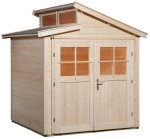 Odsadená šikmá strecha obsahuje dve integrované strešné okná, ktoré poskytujú dostatok prirodzeného svetla. Na výrobu bolo použité výhradne kvalitné smrekové drevo. Súčasťou stavebnice sú bezpečné dvojkrídlové dvere s kvalitnou sadou kľučiek, cylindrickým zámkom. Drevo pochádza z udržateľného lesníctva (certifikáty PEFC a FSC).Okná sú vyrobené z priehľadného skla. Maximálne zaťaženie strechy 75 kg/m2.