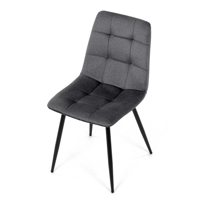 Súčasťou setu sú štyri pohodlné stoličky čalúnené hladkou látkou v odtieňoch bielej a nebo sivej. Stoličky sú navrhnuté s dôrazom na komfort a štýl – ergonomicky tvarovaná opierka poskytuje pohodlie aj pri dlhšom sedení. Čierne kovové nohy pri stoličkách ladia so stolom a dodávajú setu harmonický a jednotný vzhľad.