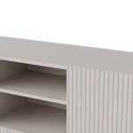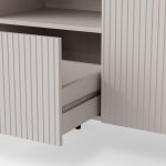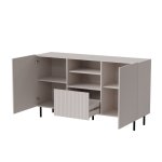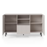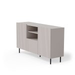 Korpus z matnej laminovanej DTD v kombinácii s bezúchytovým čelom z laminovanej MDF potiahnutej PVC fóliou zaručuje dlhú životnosť a jednoduchú údržbu. Výrazné drážkovanie dvierok pridáva na výnimočnosti a jedinečnosti tejto designové komody.