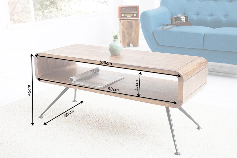 Tento konferenčný stolík v modernom retroštýle zaujme svojim elegantným dizajnom a kvalitným prevedením. Je vyrobený z masívneho sheeshamového dreva, ktorého prirodzená kresba dodáva každému kusu jedinečný vzhľad. Kombinácia teplého odtieňa dreva s čiernymi kovovými nohami vytvára harmonický kontrast, ktorý ľahko zapadne do akéhokoľvek interiéru.
