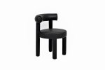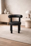 Moderná, čalúnená stolička z čiernej umelej kože. Jej jednoduchý dizajn je založený na módnych, zaoblených tvaroch a konštrukcia je celá potiahnutá látkou.