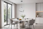Lampa wisząca nad stół w jasnej jadalni Ta lampa wisząca wprowadza spójne oświetlenie do przestrzeni, w której stół dominuje we wnętrzu. Metalowy korpus w odcieniu srebra harmonizuje z chłodnymi blatami, frontami i stalowymi detalami. Marka Lighting łączy tu prostą formę z funkcją zmiany barwy światła w ciągu dnia. Zwis na linkach pozwala zawiesić oprawę nisko nad blatem, pozostawiając swobodę poruszania się wokół stołu. Okrągły kształt dobrze koresponduje z kolistym stołem, porządkując centrum jadalni. Oświetlenie stołu podczas posiłków i spotkań Lampa wisząca do jadalni równomiernie doświetla talerze podczas codziennych posiłków. Neutralne światło sprzyja rozmowie przy stole, nie dominując nad naturalnym światłem z okien. Przy wieczornym spotkaniu rodzinym cieplejsza barwa podkreśla fakturę obrusu i naczyń. Jedno centralne źródło światła porządkuje strefę jedzenia w otwartej przestrzeni z salonem lub kuchnią. Srebrne wykończenie dobrze odnajduje się w nowoczesnych zabudowach z jasnymi frontami i kamiennym blatem. Rozsył światła i zmiana barwy w ciągu dnia Zmienna barwa światła pozwala przejść od chłodnego tonu do pracy przy laptopie przy stole, do ciepłego światła podczas późnej kolacji. Strumień 2100 lumenów zapewnia wyraźne oświetlenie blatu, dzięki czemu łatwiej czytać dokumenty lub odrabiać lekcje. Zintegrowany moduł LED równomiernie podświetla silikonową osłonkę, eliminując ostre punkty i cienie na powierzchni stołu. Zawiesie na linkach stabilizuje położenie oprawy, co docenia się przy częstym rozsuwaniu i ustawianiu stołu. Pojedyncze źródło światła upraszcza sterowanie oświetleniem, szczególnie w jadalni połączonej z kuchnią i salonem. Lampa do nowoczesnej, uporządkowanej strefy dziennej Ta lampa wisząca sufitowa sprawdzi się w otwartej przestrzeni, gdzie jadalnia łączy się z częścią wypoczynkową. Okrągła, metalowa forma porządkuje centrum wnętrza i podkreśla charakter nowoczesnej strefy dziennej z dominacją jasnych, gładkich powierzchni.