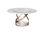 Originálny stolík s podnožou z bielej imitácie mramoru a ružovým zlatom brúsenej nerezovej ocele. Okrúhla stolová doska a nadstavec sú biele so vzorom imitujúcim mramor.
