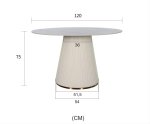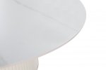 Moderný stolík s kužeľovou podnožou, potiahnutý ekologickou kožou vytvárajúcou zvislé plisovanie, zakončený zlatým akcentom. Okrúhla biela doska je imitáciou mramoru.