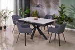 Vďaka vysoko kvalitnému zamatovému čalúneniu s výrazným dekoratívnym prešívaním v kombinácii s oceľovým rámom s práškovým nástrekom, je stolička stelesnením odolnosti a pohodlia. Ergonomický dizajn, kvalitné materiály a starostlivé spracovanie zaručujú, že sa budete cítiť pohodlne aj počas dlhých jedál. Otočná funkcia pridáva kreslu ďalšiu vrstvu pohodlia a praktickosti, čo ho robí ideálnym pre rôzne situácie a potreby.