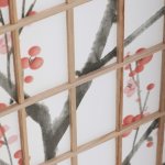 Trojpanelový paraván z masívneho smrekového dreva v prírodnom odtieni ponúka ľahkú a vzdušnú prepážku s bielou netkanou textíliou, ktorá je zdobená jemným motívom vetiev s kvetmi a vtákmi v čiernych a červených tónoch. Pevné drevené rámy zaisťujú stabilitu a zároveň umožňujú ľahké skladanie a premiestnenie.