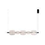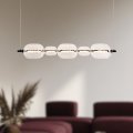 Lampa wisząca nad strefę spotkań domowych Pozioma lampa wisząca porządkuje przestrzeń nad stołem, wyspą lub ławą w salonie. Ciepłe światło 3000K sprzyja spokojnym rozmowom i wspólnym posiłkom po pracy. Szklane, bezbarwne klosze nie zaburzają widoku, więc wnętrze pozostaje wizualnie lekkie. Metalowa konstrukcja w czerni tworzy wyraźną ramę dla strefy dziennej. Marka Studio łączy tu funkcję głównego oświetlenia z elementem porządkującym układ mebli. Lampa wisząca do jadalni i nad wyspę Szerokość oprawy sprawdza się nad prostokątnym stołem w jadalni. Pięć punktów świetlnych równomiernie oświetla całą długość blatu podczas posiłków. W kuchni montaż nad wyspą ułatwia przygotowywanie posiłków i odkładanie naczyń. Regulowana wysokość zawiesia pozwala dopasować oprawę do wysokości domowników i poziomu blatu. Szklane klosze dobrze komponują się z gładkimi frontami i blatami z drewna lub kamienia. Rozkład światła nad stołem i blatem Zintegrowany moduł LED 15 W zapewnia stałe, przewidywalne natężenie światła podczas codziennych czynności. Strumień 900 lm daje wyraźne oświetlenie stołu, przy którym dzieci odrabiają lekcje po południu. Pięć źródeł światła rozmieszczonych liniowo ogranicza cienie przy wspólnym serwowaniu potraw wieczorem. Ciepła barwa 3000K łagodzi kontrasty na talerzach i blatach, co sprzyja odpoczynkowi po intensywnym dniu. Bezbarwne, szklane klosze nie tłumią strumienia światła, więc powierzchnia robocza pozostaje równomiernie doświetlona. Lampa do uporządkowanej, liniowej strefy dziennej Ta lampa wisząca sufitowa sprawdzi się w prostych, liniowych aranżacjach strefy dziennej. Lepiej odpowiada na potrzeby wnętrz, w których główny blat lub stół stanowi centralny punkt domowych aktywności.