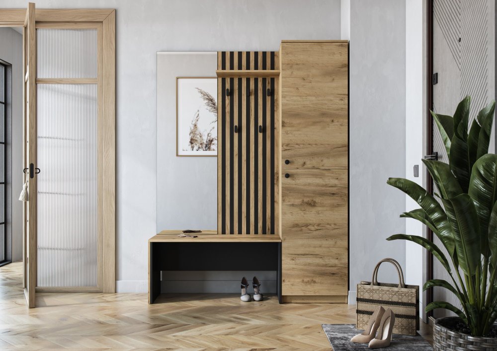 Zostava ponúka premyslené usporiadanie na každodenné využitie. Súčasťou je šatníková skriňa, vešiaková stena, zrkadlo a lavica, vďaka čomu budete mať kabáty, obuv aj doplnky vždy prehľadne uložené a po ruke.