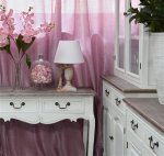 Konzola v provenzálnom štýle s bielymi rezbami s vymazanou tmavo hnedou doskou. Produkt má kovové rukoväte a ohnuté nohy.