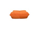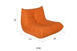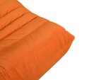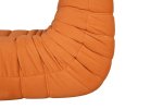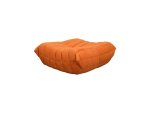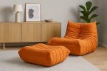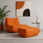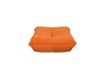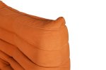 Moderné, ikonické kreslo s jednoduchým tvarom a detailmi v podobe horizontálneho prešívania s prešívanou centrálnou zvislou čiarou, v oranžovej farbe, v súprave s podnožkou.