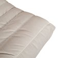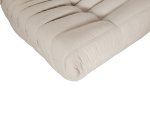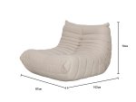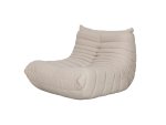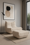 Moderné, ikonické kreslo s jednoduchým tvarom a detailmi v podobe horizontálneho prešívania s prešívanou centrálnou zvislou líniou, v béžovej farbe, v súprave s podnožkou.