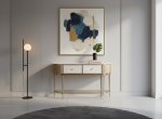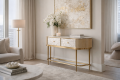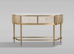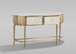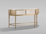 Tento jedinečný konzolový stolík v šampansko-zlatej farbe má prednú časť vyrobenú z prírodnej mušle so symetrickým vzorom. Korpus má drážkované drevo a vrchnú dosku s mramorovou povrchovou úpravou.