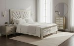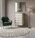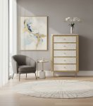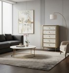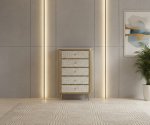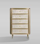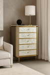 Táto jedinečná komoda so zásuvkami v šampansko-zlatej farbe má čelá zásuviek vyrobené z prírodnej mušle so symetrickým vzorom. Korpus má drážkované drevo a vrchnú časť s mramorovou povrchovou úpravou.