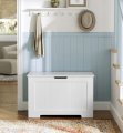 Praktická úložná lavica s vekom a dvoma bezpečnostnými pántami spája štýl, pohodlie a funkčnosť. Vďaka premyslenému systému pántov zostáva veko otvorené v uhle do 60 ° a zatvára sa jemne, takže chráni prsty pred priškripnutím. Horná doska unesie až 136 kg – lavica tak poslúži aj na sedenie pri obúvaní, zatiaľ čo priestranný úložný priestor skryje deky, vankúše či knihy. Bočné úchyty umožňujú ľahké prenášanie a matne biely povrch sa hodí do spálne, predsiene aj obývacej izby. Montáž je jednoduchá vďaka prehľadnému návodu a očíslovaným dielom.