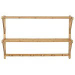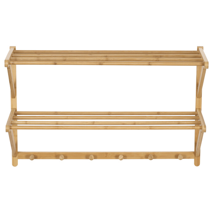 Nástenná polica s vešiakmi je vyrobená z masívneho bambusu v prírodnom odtieni, ktorý prináša do interiéru príjemnú a sviežu atmosféru. Polica ponúka dve úložné plochy tvorené pevnými tyčami, ktoré sú vhodné na odkladanie drobných predmetov či textilu. Spodná časť je vybavená šiestimi okrúhlymi vešiakmi, ktoré umožňujú praktické zavesenie kabátov, klobúkov alebo tašiek.