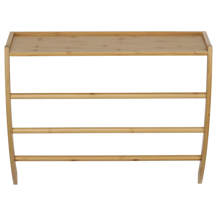 Nástenná polica s vešiakmi je vyrobená z masívneho bambusu v prírodnom odtieni, ktorý vnáša do interiéru príjemný a teplý vzhľad. Jej elegantný oblúkový tvar a dve vodorovné tyče pod policou umožňujú praktické zavesenie drobných predmetov alebo textílií.